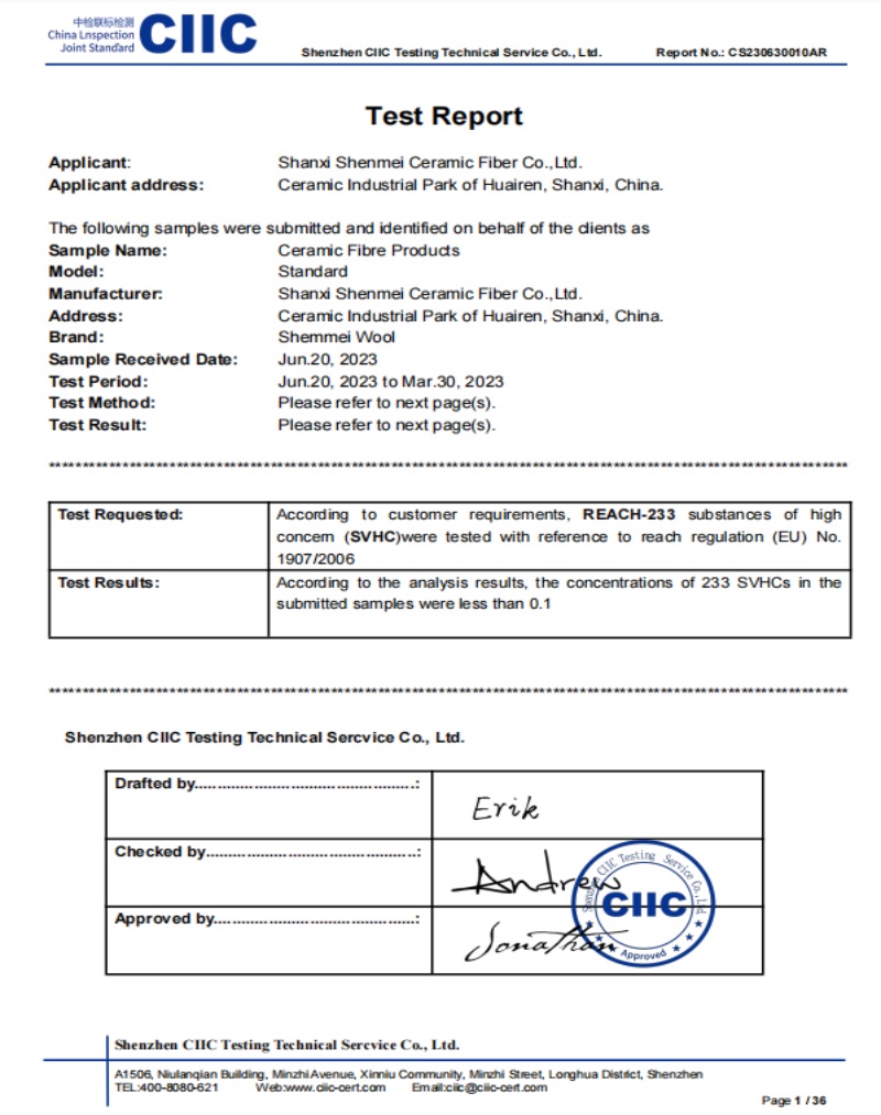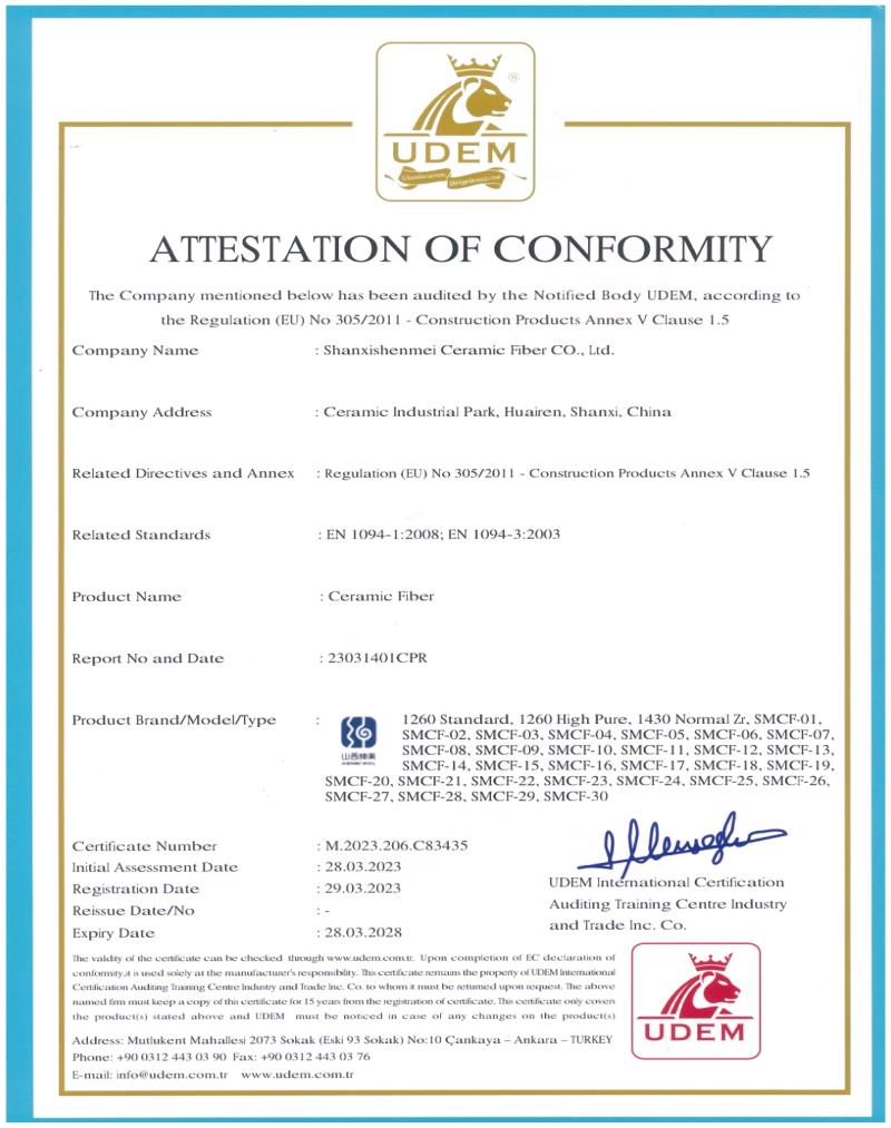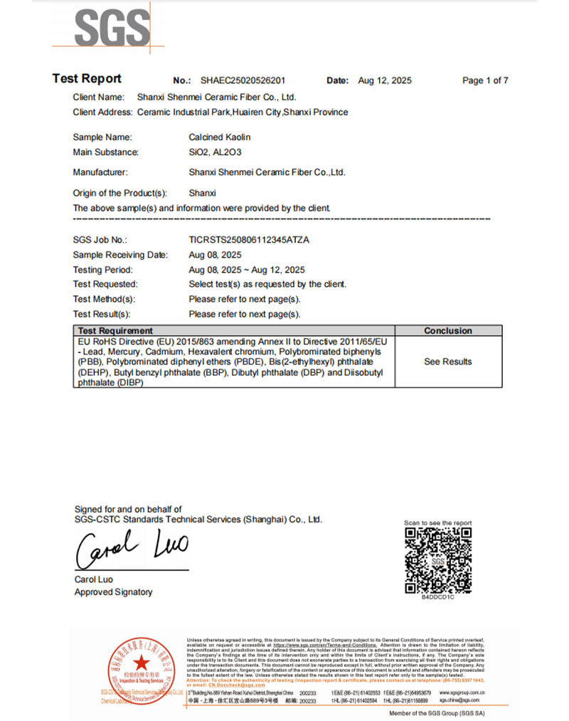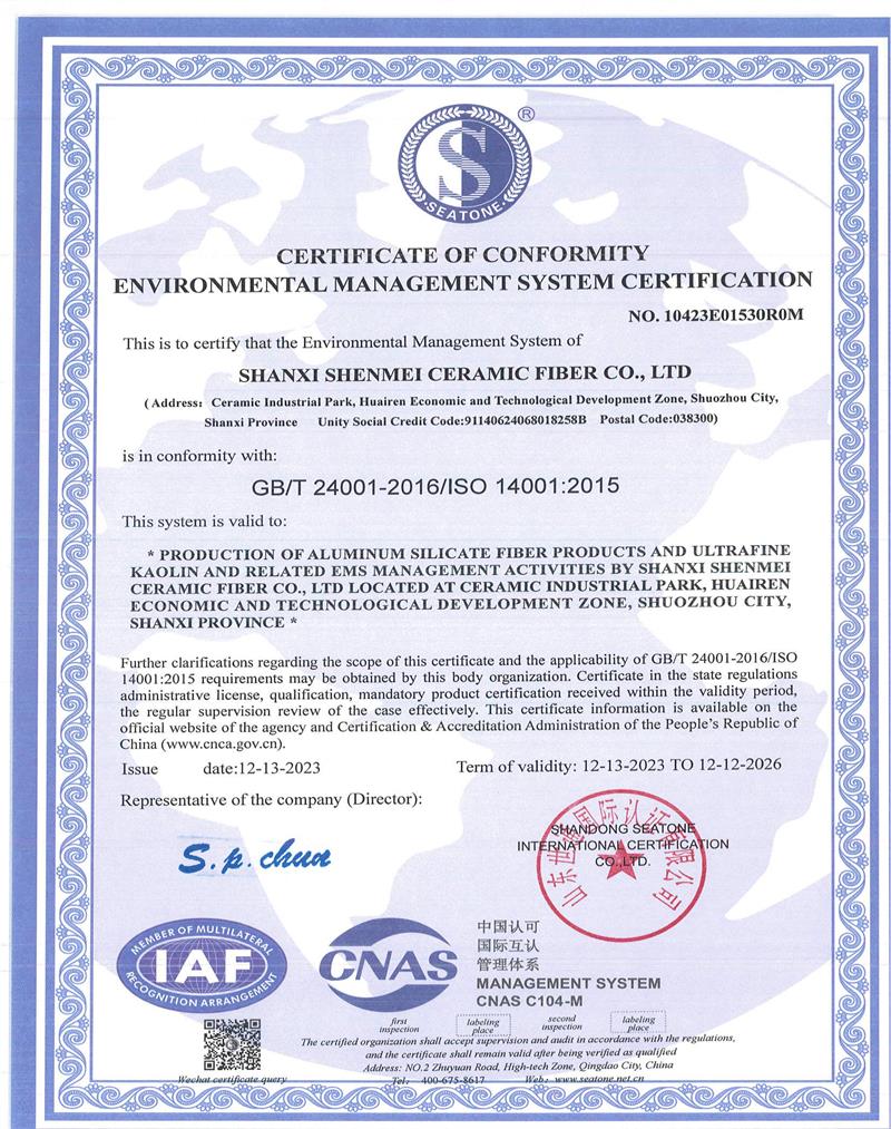 As a leading manufacturer of calcined kaolin and ceramic fiber products, Shanxi Shenmei Ceramic Fiber Co., Ltd. holds multiple internationally recognized certifications, including: